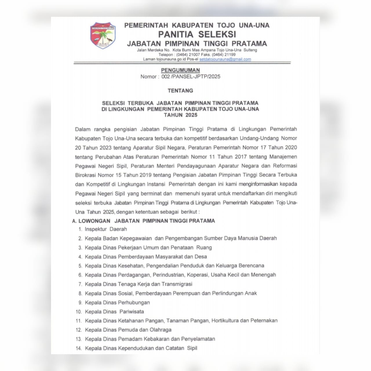 diskominfo.tojounauna.go.id, 𝑻𝒐𝒖𝒏𝒂 – Pemerintah Kabupaten Tojo Una-Una melalui Panitia Seleksi, resmi mengumumkan pelaksanaan Seleksi Terbuka Jabatan Pimpinan Tinggi (JPT) Pratama di lingkungan pemerintah daerah untuk tahun 2025. Pengumuman ini disampaikan melalui Surat Nomor: 002/Pansel-JPTP/2025.